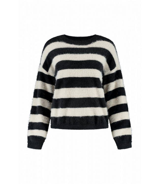 The Aurelia Striped Knit Sweater is a wonderfully soft, fluffy black sweater with a stylish beige and black striped print. The sweater has a slightly oversized fit and not only exudes warmth and comfort but is also incredibly comfortable, perfect for cold