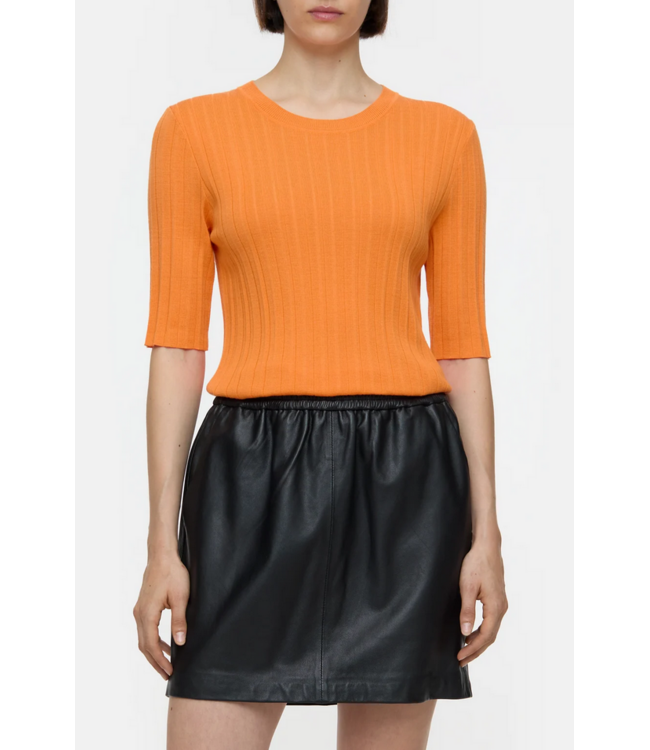 Knitted from a fine merino-silk blend yarn (14 gg) with a special pleated rib structure, our short-sleeved shirt is characterized by its soft surface. It has a figure-hugging cut and a finely ribbed cuff at the round neckline and 3/4-length sleeves.