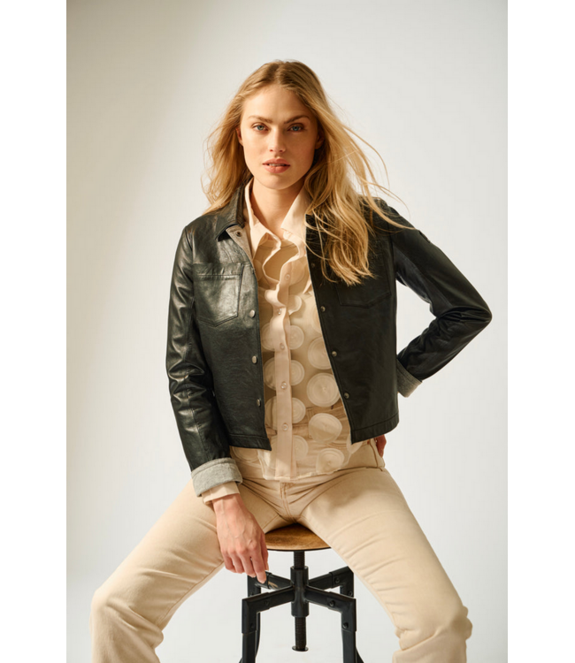 The Lefei Jacket blends style and comfort, making it the ultimate wardrobe staple. This cropped, collared shirt jacket is crafted with light leather bonded to a poly-cotton blend fabric, offering a unique and fashionable edge.
