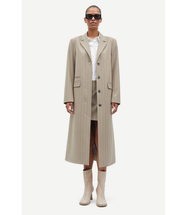 Long coat with a regular fit. Single-breasted button closure on the front and buttoned cuffs. Flap pockets and single welt pocket on the front. Notched lapel. Vent at the back. Fully lined.