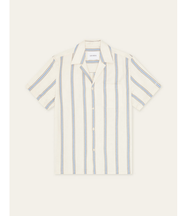 A lightweight short sleeve shirt in soft cotton twill with a clean vertical stripe. Designed with a relaxed camp collar and finished with a simple chest pocket.