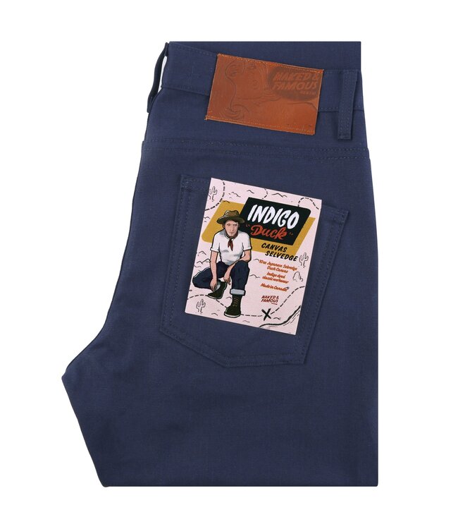 The Indigo Duck Canvas Selvedge is a 10oz Japanese Selvedge canvas woven on vintage shuttle looms in a tightly woven plain weave construction. Used primarily as work wear because of its strength and durability, the fabric also has a relatively smooth surface making it less prone to snagging and tearing. Duck canvas was once the fabric of choice used to make jeans before denim became popular in the late 1800’s. Other details include tonal stitching, full grain English tan leather patch, red selvedge ID, silver metallic buttons and rivets.