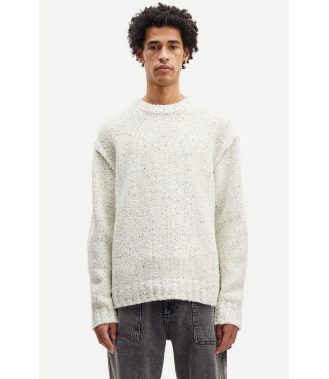 Regular fitting crew neck jumper with rib trimmed collar, cuffs and hem. Fully fashioned seams. Chunky knit, wool and polyamide blend yarn with textured mélange look.
